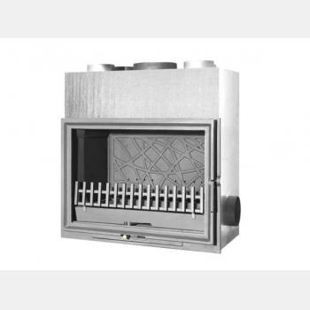 Foyer à bois compact, avec porte fonte, plaque fond linéaire et pare buche rustique. Différents choix possibles pour plaque de fond, pare buche et liseré.